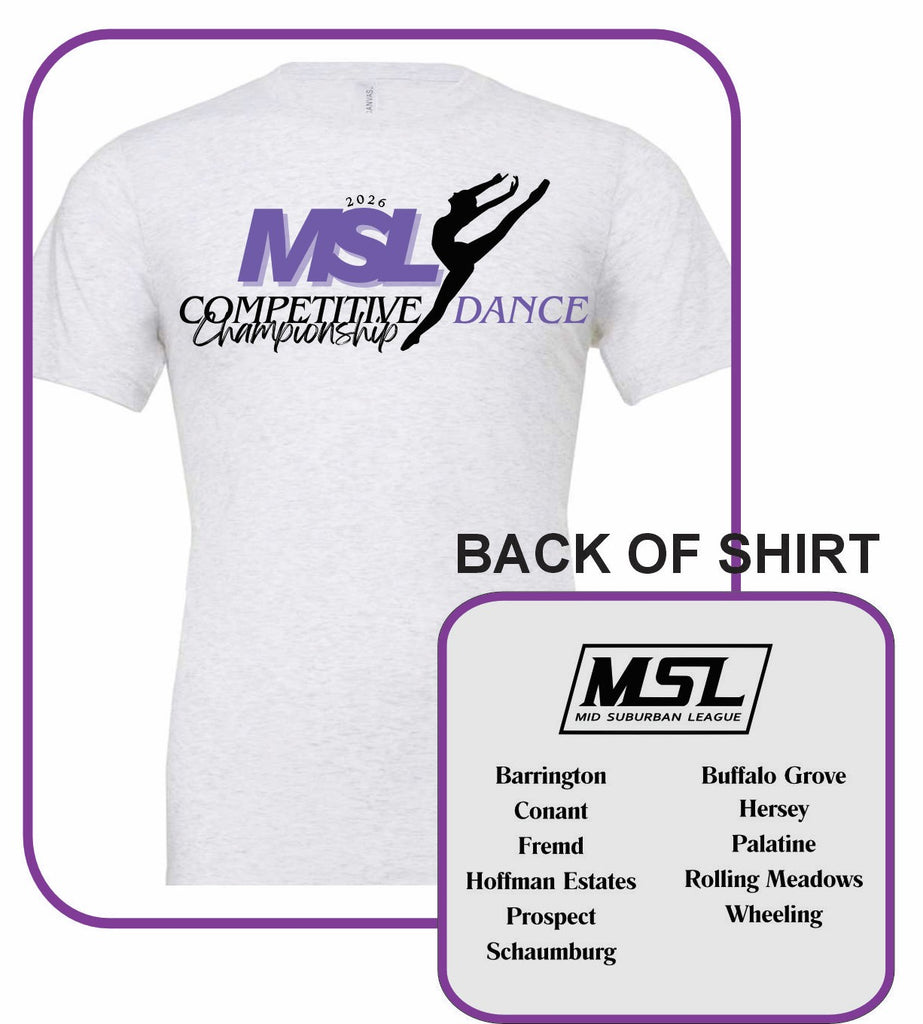 Printed front and back - custom designed official 2026 MSL Conference Competitive Dance Championship T-Shirt. This t-shirt is both durable and soft - a great combination. Wear your High School pride and its Competitive Dance program, with this official graphic t-shirt.