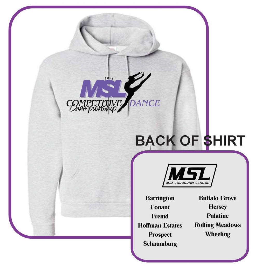 Custom designed official 2026 MSL Conference Competitive Dance Championship Hoodie. Great Quality! Printed front and back - Dance members will love wearing this hoodie at competition or practice!