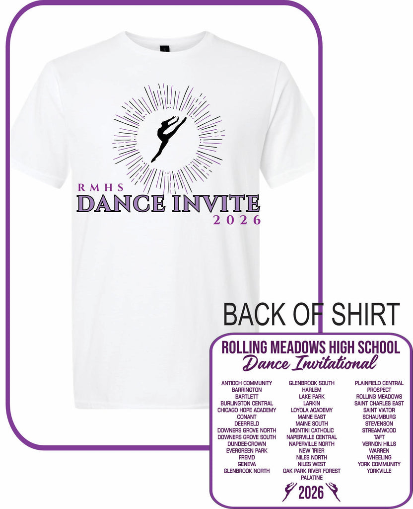 Printed front and back - custom designed official 2026 Rolling Meadows Dance Invite T-Shirt. This t-shirt is both durable and soft - a great combination. Wear your High School pride and its Competitive Dance program, with this official graphic t-shirt.