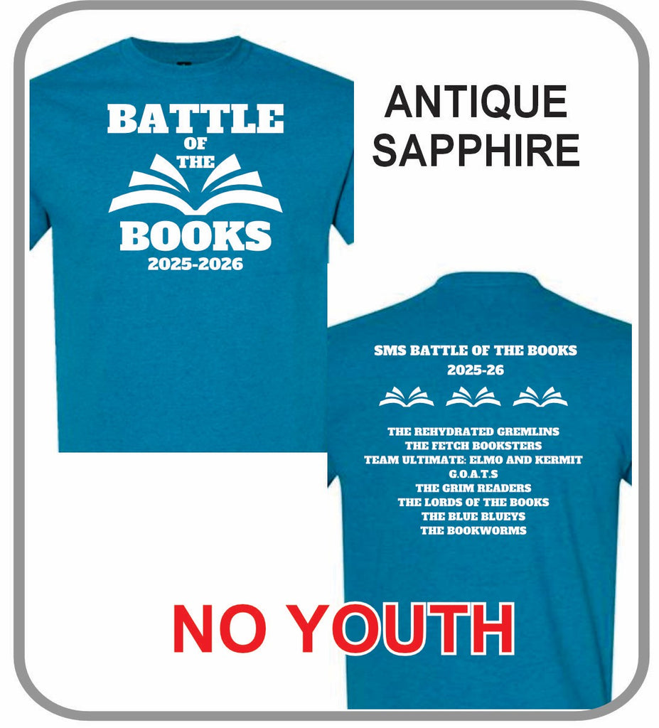 Custom designed this official South Middle School - Battle of the Books T-Shirt - includes books listed on back! Wear your team member pride with this official graphic t-shirt. Also great for the proud Parents, Grandparents and the reading enthusiast.